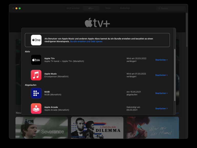 Eine Kündigung der Abos ist in der Apple TV+ App für iOS-Geräte und den Mac möglich. Auf dem Mac rufen Sie im Account-Menü die Accounteinstellungen auf. Ganz unten im Dialog finden Sie die Zeile „Abos“ gefolgt von der Zahl der Abos und einem „Verwalten“-Link. Unter Optionen ist der „Abo kündigen“-Button.