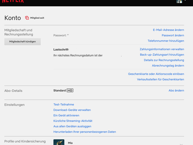 Abos lassen sich in der Netflix-App weder starten noch beenden, für die Kontoeinstellungen muss die Netflix-Website aufgerufen werden. Dort ist unter dem Punkt „Mitgliedschaft und Rechnungsstellung“ ein großer grauer Button „Mitgliedschaft kündigen“.