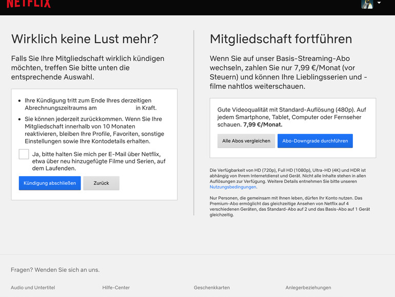 Nun fragt Netflix noch einmal nach und bietet gegebenenfalls einen Wechsel auf das Basis-Abo (SD-Qualität, 7,99/Monat) an. Die Kündigung tritt nicht sofort in Kraft, sondern erst zum Ende des Abrechnungszeitraums. Wer einen Monat bingen will, kann also auch sofort nach dem Abo-Start kündigen.