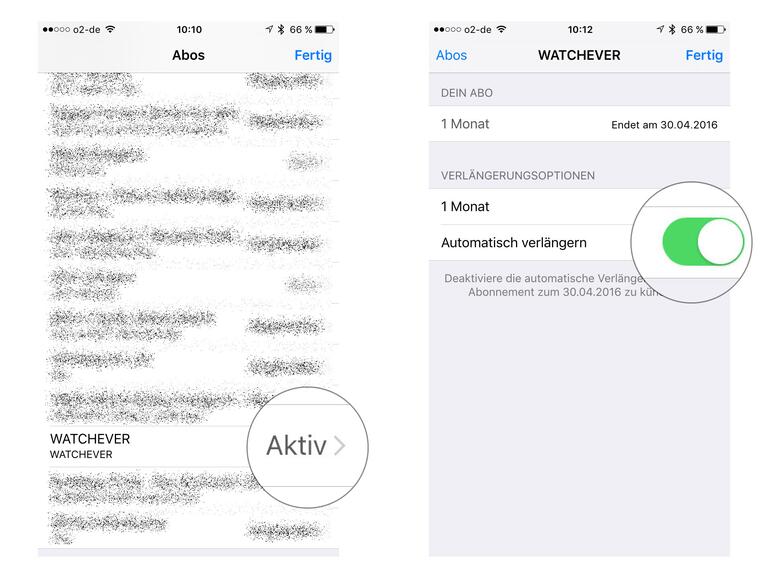 Schritt 6: Setze jetzt neben "Automatisch verlängern" den blauen Punkt auf "Aus" und klicke dann auf "Fertig".
