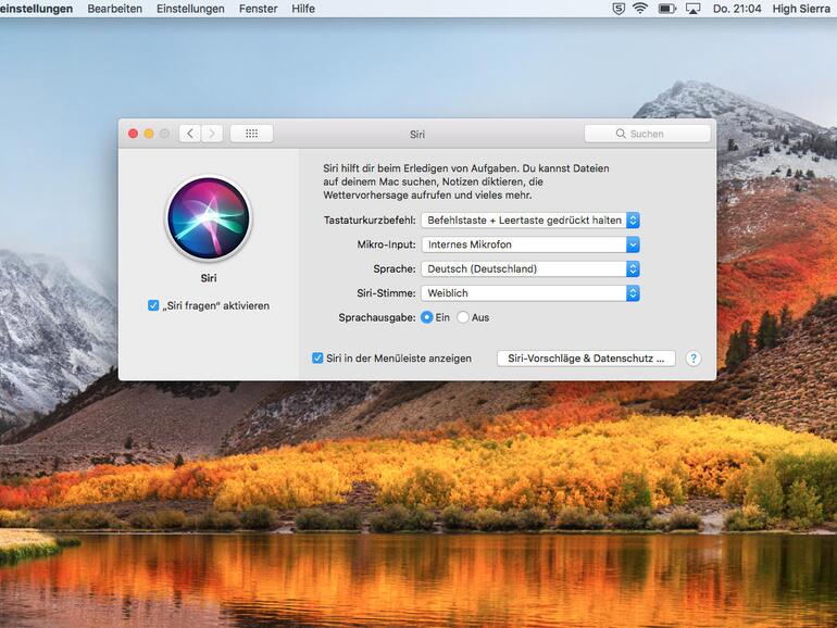 Nachdem Sie Siri aktiviert haben, trägt sich der Sprachassistent oben rechts in die Menüleiste Ihres Mac ein. Klicken Sie nun auf ihr Piktogramm, öffnet sich ein Eingabefenster mit der Siri-typischen Audiowelle, die signalisiert, dass der Sprachassistent auf Ihre Eingaben wartet. Sie können den Menüeintrag in den Siri-Voreinstellungen allerdings auch deaktivieren. Hier legen Sie etwas auch den Tastaturkurzbefehl fest, mit dem Sie Siri alternativ aktivieren. Als Standard ist [cmd]+[Leertaste] eingestellt.
