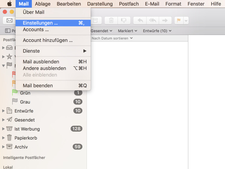 Öffnen Sie zunächst die Mail-App auf Ihrem Mac, wenn Sie das nicht schon getan haben. Klicken Sie nun in der Menüleiste am oberen Bildschirmrand auf „Mail“ und wählen aus der Liste den Eintrag „Einstellungen“ aus.
