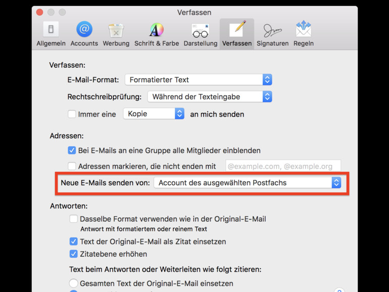 In den Einstellungen sehen Sie jetzt verschiedene Reiter. Wählen Sie jedoch den Reiter „Verfassen“ aus. In dem Tab sehen Sie nun auch den Punkt „Neue E-Mails senden von“. Klicken Sie auf das Dropdown-Menü dahinter und wählen anschließend die gewünschte E-Mail-Adresse aus.