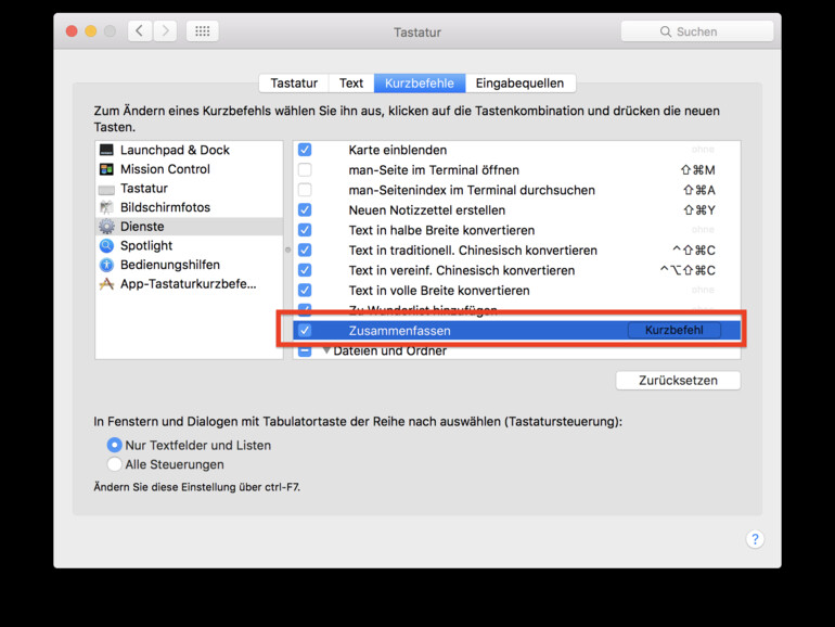 Klicken SIe in der Menüleiste am oberen Bildschirmrand auf das Apple-Logo und wählen Sie „Systemeinstellungen“ aus. In den Systemeinstellungen klicken Sie dann auf „Tastatur“. Klicken Sie jetzt auf den Reiter „Kurzbefehle“ und wählen Sie aus der Seitenleiste links den Punkt „Dienste“ aus. Im rechten Feld scrollt man nun nach unten. Unter der Zwischenüberschrift „Text“ finden Sie die Funktion „Zusammenfassen“. Setzen davor einen Haken. Der Dienst ist nun aktiviert. Sie können die Systemeinstellungen jetzt wieder schließen.