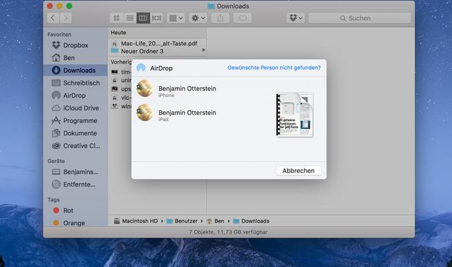 Um eine Datei an ein anderes Apple-Gerät geschickt werden kann, muss man am Mac lediglich einen Rechtsklick auf selbige machen und anschließend aus dem Kontextmenü „Bereitstellen" → „AirDrop" auswählen. Nun werden alle verfügbaren Geräte in der Umgebung angezeigt. Klicke auf das gewünschte Gerät. Sind der Mac und das iOS-Gerät mit derselben Apple ID angemeldet, werden die Daten direkt übertragen. Handelt es sich um ein fremdes Gerät muss der Empfänger erst die Übertragung annehmen.