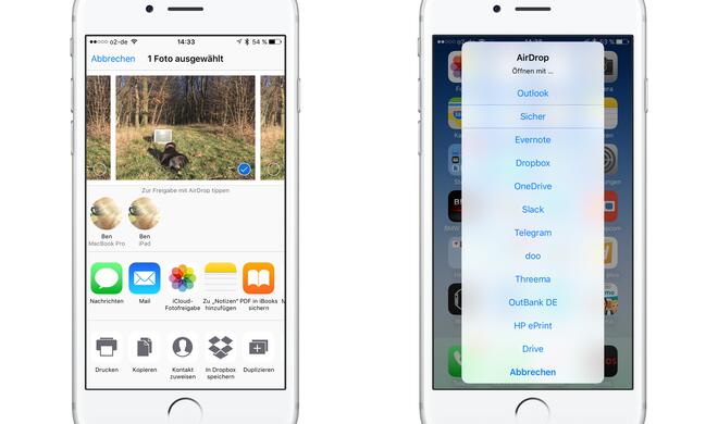 Ähnlich einfach funktioniert es auch in der anderen Richtung. Tippt man auf das Teilen-Symbol in einer beliebigen App, dann werden oftmals gleich am oberen Ende des Kontextmenüs AirDrop und die verfügbaren Geräte angezeigt. Wähle mit einem Fingertipp das gewünschte Gerät aus und schon werden die Daten übertragen. Auch hier kann es vorkommen, dass der Empfänger den Datenaustausch erst autorisieren muss.