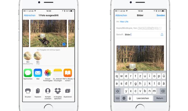 Unter iOS geht die ähnlich einfach von der Hand wie am Mac. Auch hier tippst du erst auf das Teilen-Symbol und anschließend auf „Mail“, sodass eine neue E-Mail für dich erstellt wird, die du wiederum an die selbst adressierst.