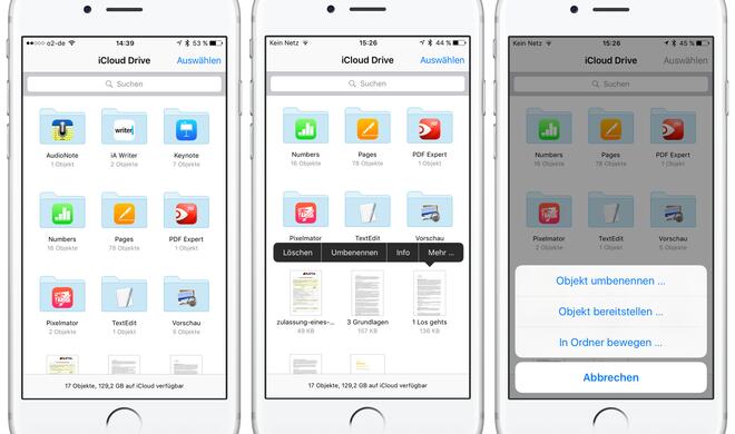 Unter iOS lassen die Dateien normalerweise entweder direkt aus der iCloud-Drive-App heraus oder der App öffnen, die die Datei auch anzeigen kann. In der iCloud-Drive-App tippst du nur auf die Datei und anschließend auf das Teilen-Symbol, das die alle Möglichkeiten zum Öffnen anzeigt.
