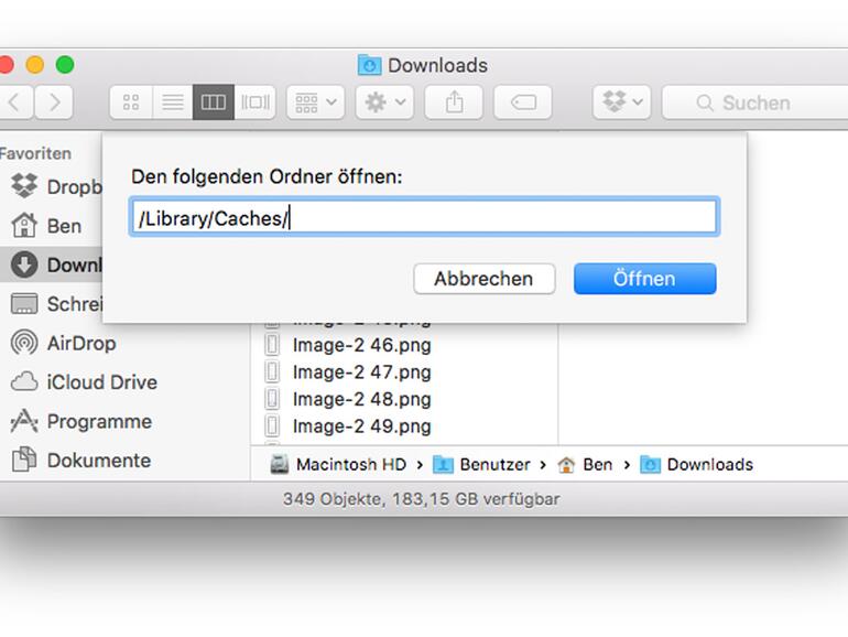 Öffnen Sie nun den Finder und klicken am oberen Bildschirmrand auf „Gehe zu“ und dann auf „Gehe zum Ordner“. Alternativ können SIe auch (shift) + Befehlstaste (cmd) + (g) gleichzeitig auf Ihrer Tastatur drücken. Geben Sie jetzt den Ordnerpfad „/Library/Caches/“ und suchen Sie die Datei „com.apple.desktop.admin.png“ in diesem Ordner, bevor Sie mit der rechten Maustaste darauf klicken, um sie zu duplizieren.