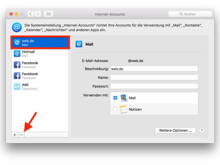 Sie sehen nun eine Übersicht über alle E-Mail-, iCloud- und sonstigen webbasierten Accounts. E-Mail-Accounts sind in den meisten Fällen mit einem „@“-Symbol versehen. Wählen Sie eines Ihrer Konten aus, um es zu löschen. Klicken Sie jetzt auf das Minus-Zeichen unterhalb der Auflistung.