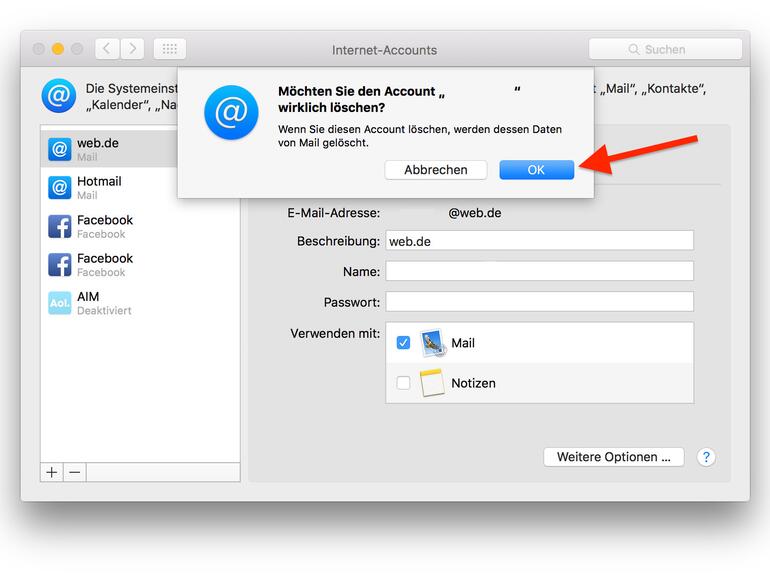 Sie werden jetzt gefragt, ob Sie den E-Mail Account löschen möchten. Klicken Sie auf „OK“. Der E-Mail Account ist nun gelöscht und Sie können die Systemeinstellungen wieder verlassen.