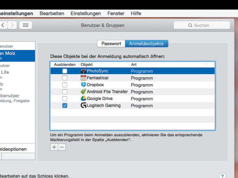- Öffnen Sie "Systemeinstellungen" -> "Benutzer & Gruppen" -> "Anmeldeobjekte", um eine Liste der Elemente anzuzeigen, die bei einem Login gestartet werden. Je mehr Einträge in dieser Liste stehen, desto langsamer wird der Startvorgang. Entfernen Sie daher nicht benötigte Elemente über die Minus-Schaltfläche.