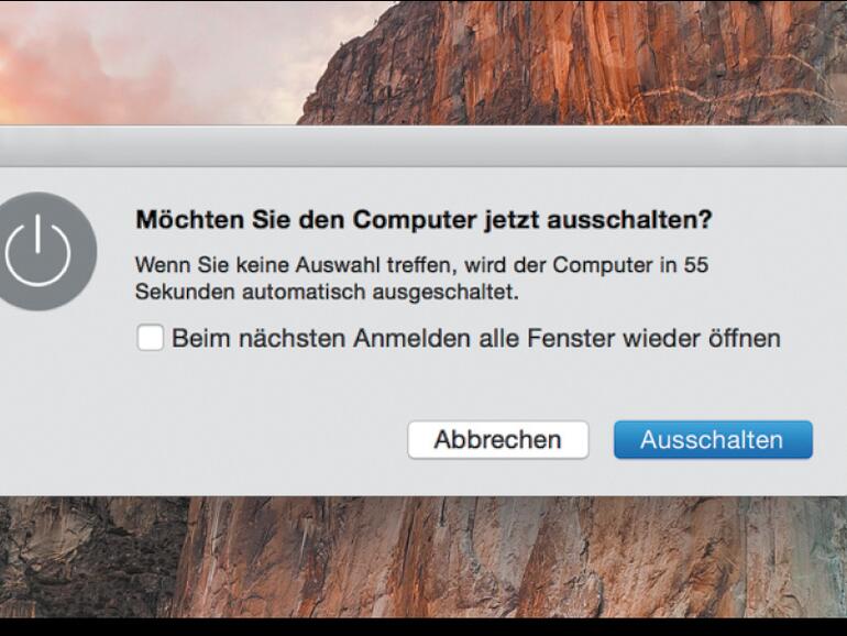 - Wählen Sie aus dem Apfel-Menü den Eintrag „Ausschalten …“ und deaktivieren Sie „Beim nächsten Anmelden alle Fenster wieder öffnen“. Die Abwahl dieser Funktion verhindert, dass OS X beim Starten wertvolle Zeit mit dem Öffnen nicht benötigter Anwendungen verschwendet.