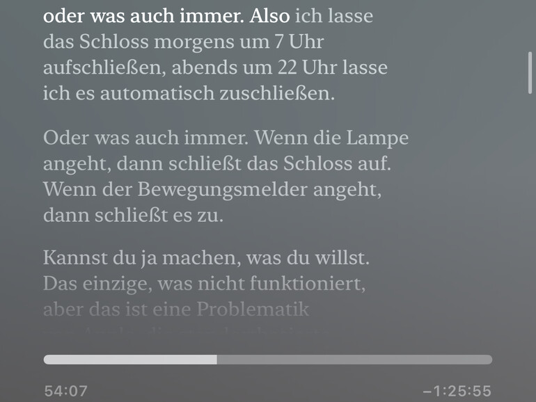 Die Aktivierung erfolgt dabei ziemlich einfach. Starte einen Podcast in der Podcasts-App und öffne das Wiedergabefenster. Unterhalb der Lautstärke findest du drei Buttons. Wähle den linken mit der Sprechblase aus. Die Datei wird kurz analysiert. Anschließend siehst du das Transkript. Tippst du übrigens auf ein Wort, springt der Podcasts sofort an die Stelle.