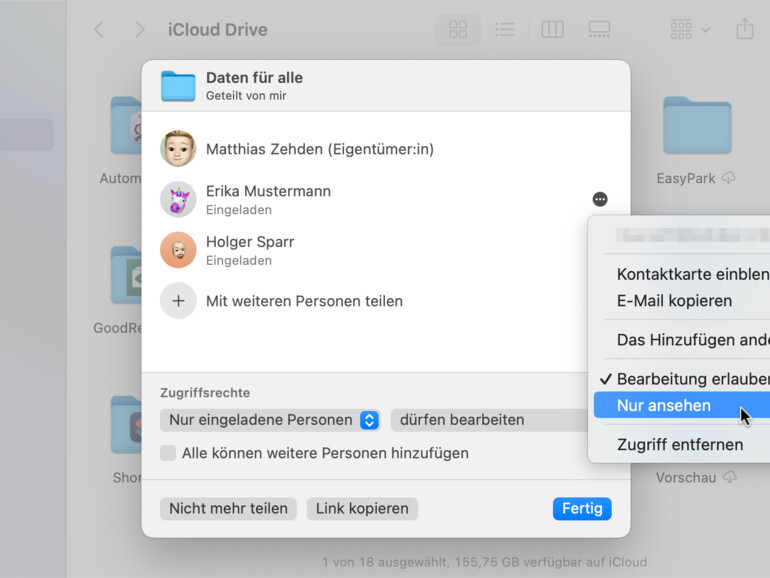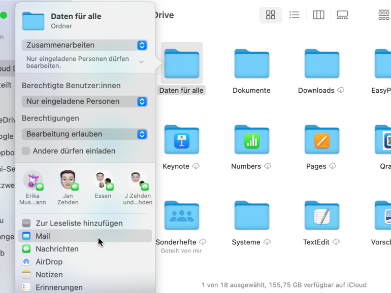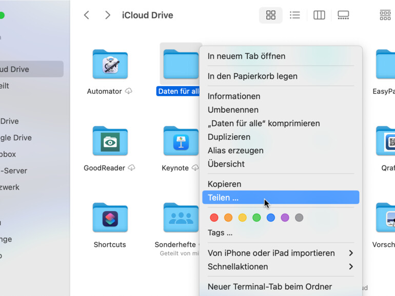Um einen Ordner auf iCloud Drive freizugeben, markiere ihn und rufe im Kontextmenü „Teilen“ auf. Wähle im Menü „Zusammenarbeiten“ und klicke auf den Text darunter.