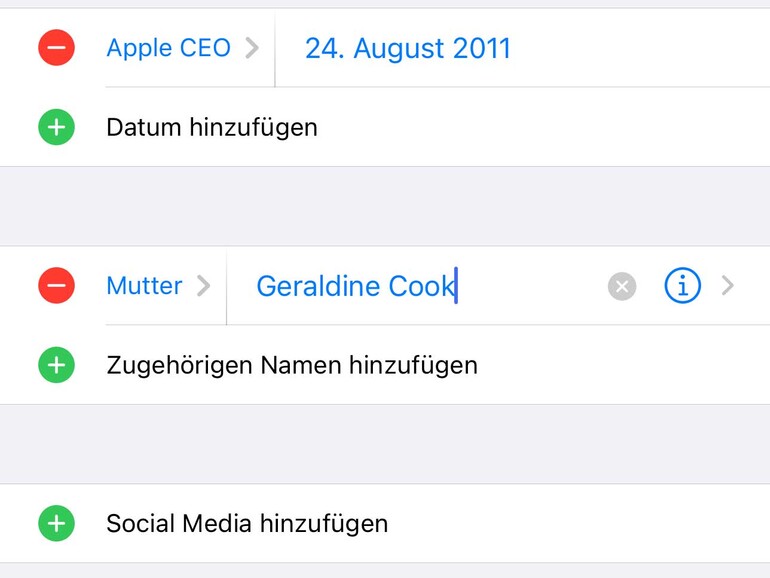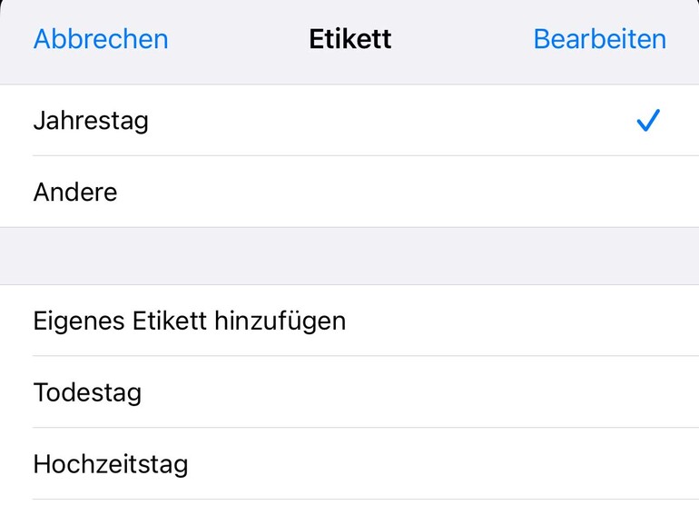 Hast du viele Kontakte in deinem Adressbuch, die zueinander in Verbindung stehen – beispielsweise aus der Kita oder der Schule – lohnt es sich, das Feld „Zugehörigen Namen“ auszufüllen. Das Etikett („Mutter“) kannst du ändern, indem du einfach darauf tippst. Es öffnet sich eine Liste, die du mit einem Tipp auf „Alle Etiketten“ noch erweitern kannst. Diese Liste ist lang und enthält exakte Bezeichnungen wie „Schwägerin (Ehefrau des jüngeren Bruders)“ und „Enkel (Sohn der Tochter)“. Sollte dennoch nicht das Gewünschte dabei sein, kannst du im vorherigen Menü auch eigene Etiketten erstellen. Hast du das korrekte Verwandtschaftsverhältnis gefunden, kannst du in das Feld einen Namen eintragen oder mit einem Tipp auf das i einen bestehenden Kontakt aus deinem Adressbuch wählen.