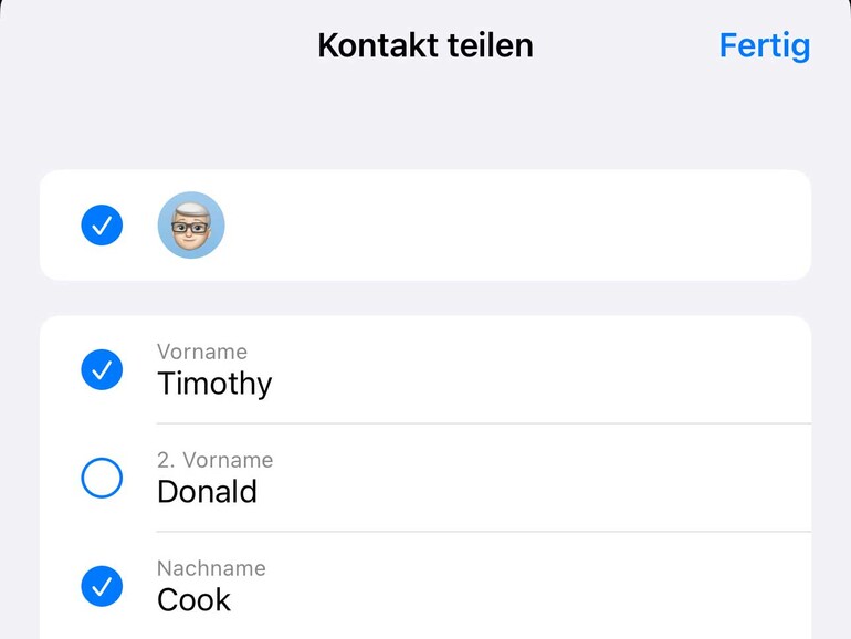 Teilst du einen Kontakt direkt aus der Kontakte-App heraus, kannst du auswählen, welche Kontaktinformationen du weitergeben möchtest. Übrigens: Um deine eigenen Kontaktdaten an andere iPhone-Nutzende weiterzugeben, genügt es seit iOS 17, die iPhones aneinanderzuhalten. Vorausgesetzt, die Option „Geräte aneinanderhalten“ ist auf beiden Geräten in den Einstellungen unter „Allgemein“ > „AirDrop“ aktiviert.