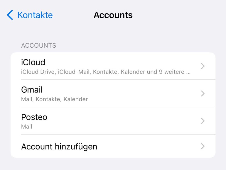 Ebenfalls in den Einstellungen unter „Kontakte“ findest du die von dir eingerichteten „Accounts“, die potenziell Kontakte enthalten können. Neben deinem iCloud-Account könnte dies ein Gmail- oder Microsoft-Konto sein. Möchtest du verhindern, dass Adressdaten aus anderen Quellen in deiner Kontakte-App auftauchen, kannst du den Eintrag „Kontakte“ in dem jeweiligen Account ganz einfach deaktivieren, indem du den grünen Schalter nach links wischst. Bereits synchronisierte Kontaktdaten aus dieser Quelle werden daraufhin entfernt.