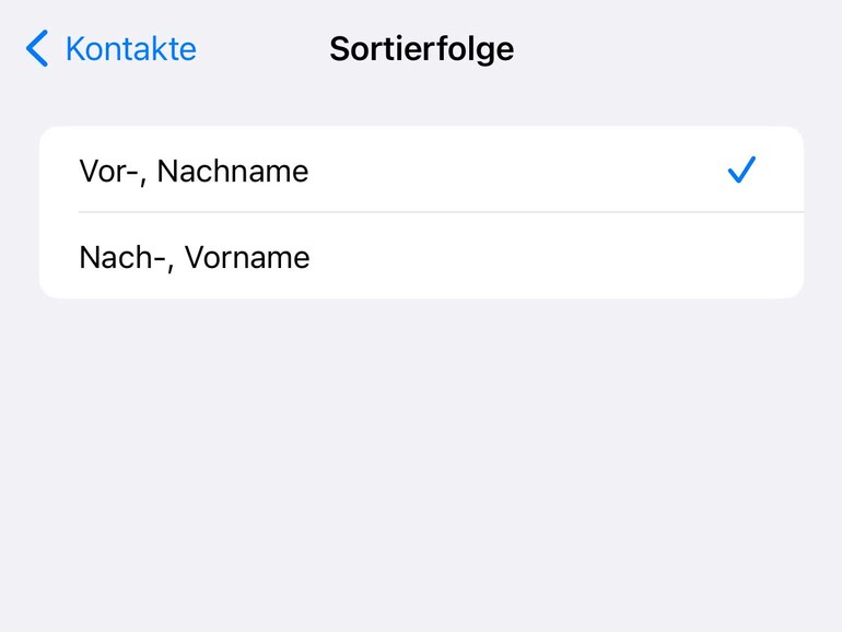 In den Einstellungen unter „Kontakte“ kannst du festlegen, ob bei den Einträgen in deinem Adressbuch erst der Vor- oder erst der Nachname angezeigt werden soll. Zudem kannst du unabhängig von der Anzeigefolge auch bestimmen, ob die Einträge nach dem Vornamen oder nach dem Nachnamen sortiert werden sollen. Leider bezieht sich diese Einstellung nur global auf die gesamte Kontakte-App. Mitunter wäre es praktisch, die Sortierung für einzelne -Listen festlegen zu können.