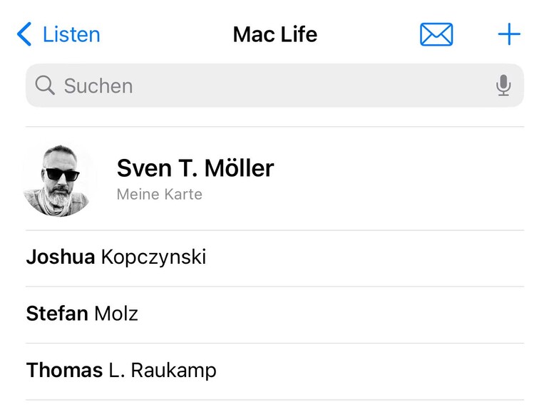 Nicht nur bei einer großen Anzahl von Kontakten kann es sich lohnen, die Visitenkarten in Listen zu sortieren. So kannst du beispielsweise alle Kontakte dieser Liste auf einmal exportieren oder eine E-Mail an alle schreiben. Letzteres funktioniert einerseits aus der Liste selbst heraus, mit einem langen Tipp auf die Liste in der Listenansicht, aber auch direkt in der Mail-App, indem du einfach den Namen der Liste in das Empfänger-Feld eingibst. Um eine neue Liste anzulegen, navigierst du zunächst in die Listenansicht mit einem Tipp auf „Listen“ oben links und anschließend auf „Neue Liste“ oben rechts. Vergib einen Namen und öffne die Liste, um Kontakte aus deinem Adressbuch hinzuzufügen.