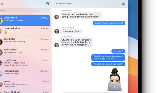 Auch ohne Face ID kannst du am Mac jetzt Memojis erstellen und sie als Sticker in Nachrichten verwenden. Daneben kannst du in macOS Big Sur auch Bilder und GIFs direkt in der Nachrichten-App suchen und verschicken. Apple hat die Anwendung fast vollständig an die iOS-Version angepasst.