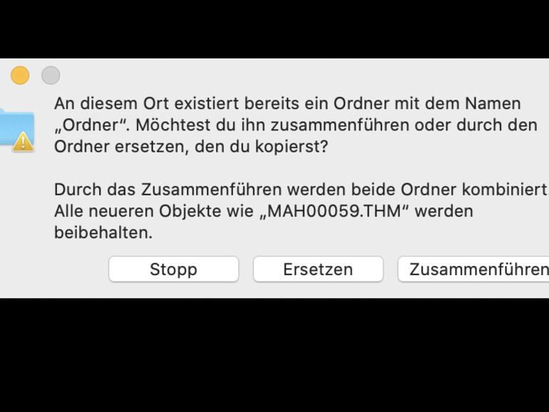 Übrigens wird die Option „Zusammenführen“ nur angezeigt, wenn man die Optionstaste gedrückt und die Ordner unterschiedliche Elemente enthalten. Sollte eine Dateibezeichnung doppelt vorkommen, dann stehen nur „Stopp“ und „Ersetzen“ zur Auswahl.