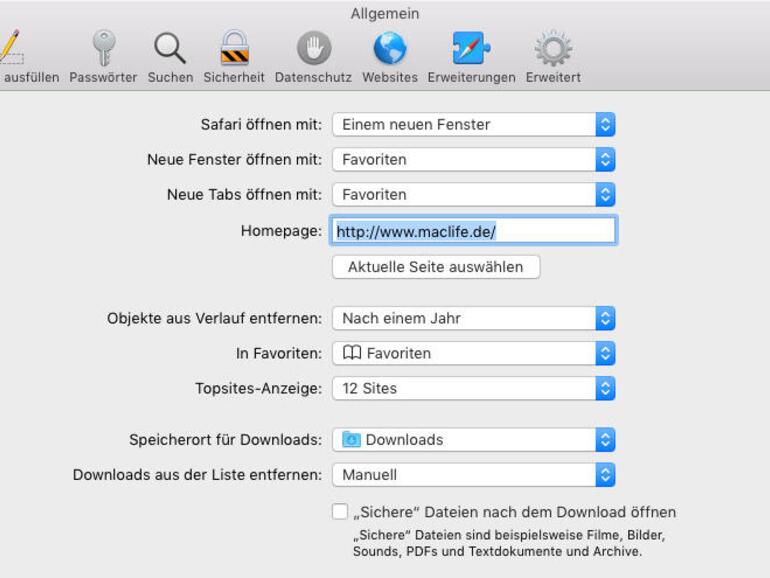 Schalten Sie in den Safari-Einstellungen unter „Allgemein“ das Öffnen sicherer Dateien ab. Downloads aus unbekannten Quellen sind niemals sicher. Ähnlich verhält es sich mit dem Nachladen von „Entfernten Inhalten“ in E-Mails.