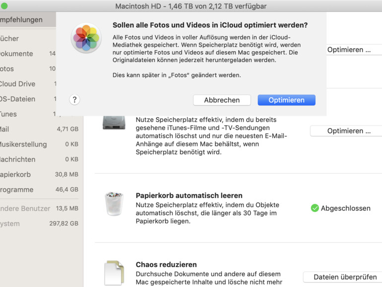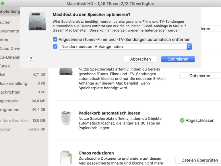 Apple versteckt diese tief in den Einstellungen. Klicken Sie dazu in der Menüleiste auf das Apple-Logo und wählen Sie „Über diesen Mac“ aus. Danach klicken Sie erst auf den Reiter „Festplatten“ und dann auf „Verwalten“. Wählen Sie anschließend in der Seitenleiste „Empfehlungen“ aus. Apple bietet Ihnen mehrere Optimierungswerkzeuge an. Klicken Sie auf neben „Speicher optimieren“ auf den Button „Optimieren“ und bestätigen Sie Ihre Eingabe. Nun werden bereits angesehene Filme und Serien aus iTunes gelöscht. Auch alte E-Mail-Anhänge werden entfernt, wenn Speicherplatz benötigt wird.