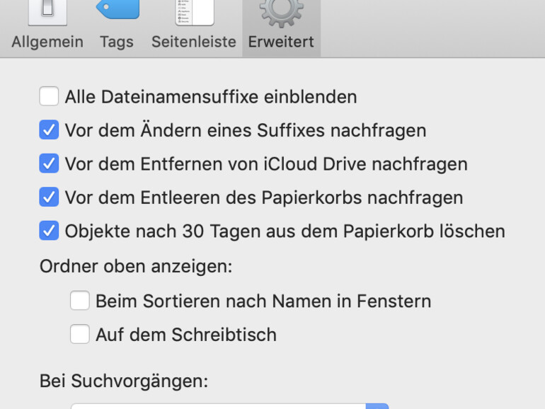 Klicken Sie zunächst auf das Finder-Icon in Ihrem Dock am unteren Bildschirmrand, um den Finder als aktive Anwendung in den Vordergrund zu holen. Klicken Sie dann in der Menüleiste am oberen Bildschirmrand auf „Finder“ und wählen Sie „Einstellungen“ aus. Wählen Sie anschließend den Reiter „Erweitert“ aus. Setzen Sie einen Haken vor „Objekte nach 30 Tagen aus dem Papierkorb löschen", um das automatische Löschen zu aktivieren.