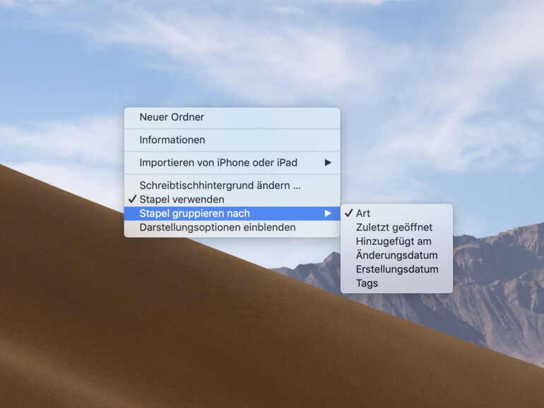 Sie müssen nicht mit der Standardsortierung der Stapelfunktion vorliebnehmen, schließlich stehen mehrere Optionen zur Auswahl. Klicken Sie zur Auswahl in der Menüleiste auf „Darstellung“ und suchen Sie unter „Stapeln nach“ nach einer für Sie geeigneten Stapelmethode. Sie haben die Qual der Wahl und können Dateien nach „Art“, „Erstellungsdatum“, „Änderungsdatum“, „Zuletzt geöffnet“, „Hinzugefügt am“ und „Tags“ sortieren. Die Anordnung ändert sich mit sofortiger Wirkung nach Ihrer Auswahl.