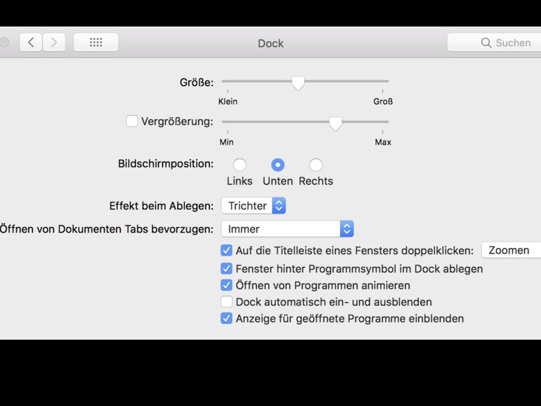 Tipp: Die Dock-Einstellungen bieten Ihnen einige sinnvoll Optionen. Wir empfehlen Ihnen die Aktivierung der Funktion „Anzeige für geöffnete Programme einblenden“.