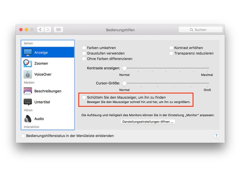 Dass das Feature in den Bedienungshilfen unter "Anzeigen" auftaucht, erscheint dabei eher merkwürdig, da die Systemeinstellungen über separate Optionen für "Maus & Trackpad" verfügen und die Funktion in der aktuellen Position Fehl am Platz wirkt und daher leicht übersehen werden kann.