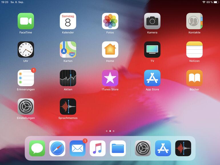 Beim Streichen vom unteren Rand nach oben verhält sich iOS 12 auf dem iPad auch etwas anders. Streichen Sie über das Dock nach oben, wechselt das iPad zum Home-Bildschirm. Streichen Sie langsam oder nicht ganz so weit, um in einer beliebigen App das Dock einzublenden. Streichen Sie hoch und halten den Finger auf dem Display, öffnet sich der App-Umschalter. Das klingt vielleicht erst einmal etwas verwirrend, funktioniert nach kurzer Gewöhnung aber prima.