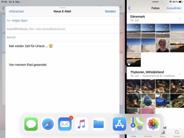 Die gleichzeitige Arbeit mit zwei Apps gewinnt auf dem iPad zusätzlich durch richtiges Drag-and-drop. Sie können zum Beispiel die App Fotos oder Dateien parallel zu einer anderen App öffnen, um passende Inhalte ganz einfach herüberzuziehen und so in ein Dokument einzufügen.