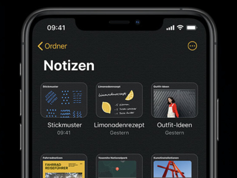 Die Notizen-App erhielt auch mit iOS 13 wieder neue Funktionen, die Ihnen die Verwaltung, den Schutz und das Verarbeiten Ihrer Notizen vereinfachen. In diesem Jahr spendierte Apple der App eine neue Ansicht, sodass Sie nicht nur auf die Listenansicht vertrauen müssen. In Ihren Ordnern finden Sie dazu das neue Galerie-Symbol. Apples versteckt dieses jedoch. Wischen Sie daher von oben nach unten, um sich die Suchleiste sowie das neue Icon anzeigen zu lassen. Ein Tipp auf das Symbol zeigt Ihnen sämtliche Notizen mit Vorschau an, damit Sie auch Zeichnungen und Bilder sehen können.