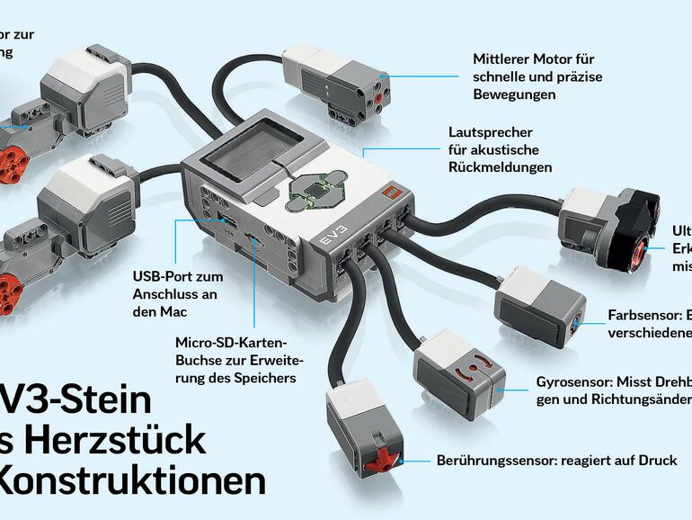 Der Legostein EV3 ist seit September 2013 in Deutschland erhältlich. Er ist die dritte Evolutionsstufe nach dem NXT und dem ersten RCX. Vom NXT gab es auch eine 2.0. Computer-gesteuertes Lego gibt mehr oder weniger seit 30 Jahren. Die programmierbaren Legosteine RCX – das steht für „Robotics Invention System“, also Roboter und Erfinden – kamen 1998. 2006 tauchte der NXT – englisch „next“, also der Nächste – auf. Seit 2013 gibt es den EV3 und für den EV3 seit dem November 2015 eine iOS-App, mit der der Lego-Block am iPad programmiert werden kann.