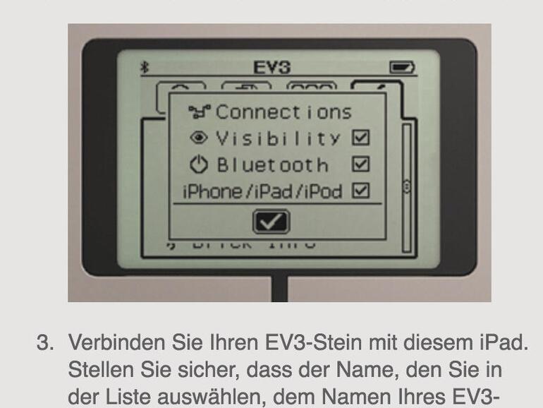 Zur Einrichtung – etwa zur Verbindung mit einem iPad oder zum Koppeln der iOS-App als Fernbedienung – muss man sich am EV3 durch das Menü auf dem nicht immer gut lesbaren Display hangeln. Bei der Programmierung kann man das Display nutzen und eigene Bilder anzeigen oder Messwerte und Meldungen ausgeben.