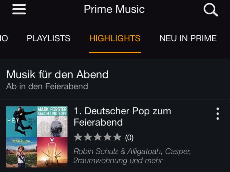 Beim ersten Start der App musst du dich wieder am Konto anmelden. Dann siehst du die Inhalte von Prime Music, wobei du über die Navigationsleiste oberhalb der Titel zwischen Empfehlungen, Radio, Playlists, Highlights, Neu in Prime und Beliebt wählen kannst. Unter der Leiste siehst du die jeweiligen Inhalte. Du kannst Alben auswählen und deiner persönlichen Prime-Bibliothek hinzufügen oder sie zur Offline-Nutzung downloaden. Du kannst die Titel aber auch direkt aus dem Amazon-Store streamen. Über das Menüsymbol oben links kannst du zwischen dem Prime-Angebot, deiner Musikbibliothek und den kürzlich verwendeten Titeln wählen. Der dritte Punkt enthält übrigens außer den gehörten Songs auch einen Eintrag für die letzten Downloads, sodass du diese hier schnell wiederfindest.