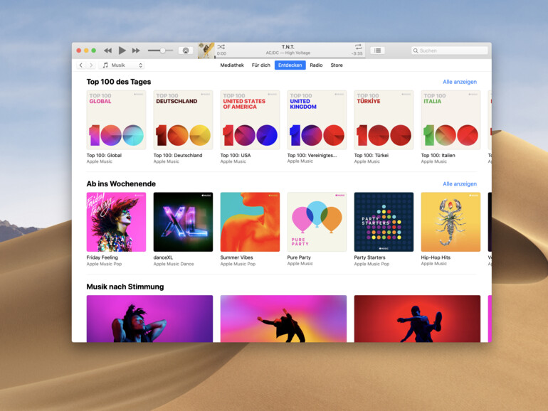 Aktuell beherbergt iTunes sämtliche Medien und macht vor allem als Musikplayer eine gute Figur. Damit jedoch nicht der gesamte Bildschirm oder ein unnötig großer Teil auf dem Schreibtisch eingenommen wird, gibt es einen MiniPlayer, der Songtitel und wichtige Steuerelemente kompakt anzeigt. Dieser lässt sich in der Menüleiste im Punkt „Fenster“ unter „Zum MiniPlayer wechseln“ oder über den Shortcut Shift + Befehlstaste (cmd) + (m) aktivieren. Über den gleichen Shortcut können Sie jederzeit zur Großansicht zurückwechseln.