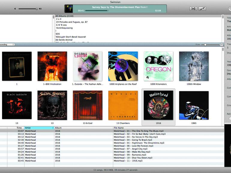 Wie VOX kann Swinsian (16,22 Euro) eine bestehende iTunes-Mediathek einlesen, lässt sich jedoch auch eingeständig verwenden. Vor allem ordnungsliebende Anwender lernen das Programm schnell schätzen, denn auf Wunsch zeigt die Bedienoberfläche Metadaten zum aktuellen Stück an, die sich mit nur einem Klick bearbeiten lassen. Auch das gezielte Ersetzen von Einträgen ist möglich. Die Anmutung lässt sich vielfältig anpassen, sodass man einerseits in Illustrationen stöbern kann oder sich in einer nüchternen Ansicht wie im Finder durch die Musiksammlung arbeitet. Mit verlustfreien Formaten wie FLAC oder APE kann Swinsian umgehen, auch lückenlose Wiedergabe beherrscht es. Schließlich wirkt die Anwendung wie ein von allem Unnötigen bereinigtes und durch sinnvolle Funktionen angereichertes iTunes. Seit Jahren beendet sich Sonora (kostenlos) in der Beta-Phase, dennoch arbeitet es wie Ecoute unter Mac OS X tadellos. Der Fokus der Anwendung liegt auf dem Visuellen.