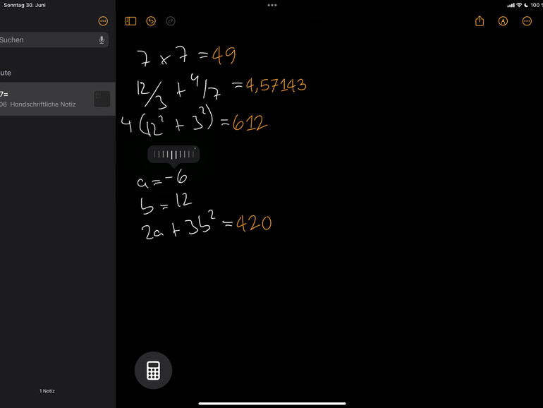 Tatsächlich verstehen sich die Mathe-Notizen, die du sowohl gesondert in der Taschenrechner-App anlegen aber auch in der Notizen-App verwenden kannst, dabei auch auf komplexere Aufgaben. Brüche, Klammern, Exponenten, Wurzeln – alles kein Problem. Sogar Variablen kannst du verwenden. Hat das System eine solche erkannt, kannst du den Wert gedrückt halten, woraufhin Regler darüber erscheint. So kannst du die Variablen (hier über der „-6“) durch einfaches Streichen nach links oder rechts anpassen und musst sie nicht für jede Berechnung neu schreiben. Wir sind restlos begeistert! Was allerdings zumindest in der zu Redaktionsschluss aktuellen Beta-Version noch fehlt, ist das Aufsummieren von Teilergebnissen. Ziehen wir in unserem Beispiel unter der letzten Zeile einen durchgehenden Strich, weiß der Apple-Rechner nichts damit anzufangen, macht mal nichts und zeigt mal eine Fehlermeldung. Hier wird Apple sicherlich nachlegen und wir sind uns sicher, darauf nicht noch einmal 14 Jahre warten zu müssen.