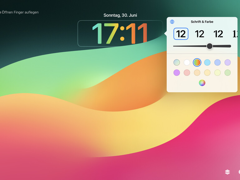 Ein weiterer Tipp aus der Kategorie „nettes Detail“: Für die Anzeige der Uhrzeit auf dem Sperrbildschirm gibt es mit iPadOS 18 eine neue Farboption: bunt. Über das entsprechend gefärbte Icon kannst du einen Farbverlauf über die Ziffern legen. Einfluss auf die konkrete Ausgestaltung dieses Verlaufs hast du allerdings nicht, sondern musst mit dem leben, was Apple für richtig hält.