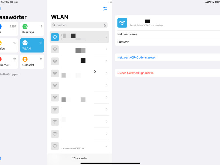 Eine ganz spezielle Funktion der neuen Passwörter-App ist besonders dann sinnvoll, wenn du nicht nur Menschen mit Apple-Geräten im Kreis der Kollegen und Freundinnen hast. Wie du vermutlich weißt, kannst du denen den Zugang zu (d)einem WLAN ganz einfach bereitstellen: Versuchen sie erstmals ihr Gerät mit dem fraglichen WLAN zu verbinden und ist dein iPhone in der Nähe, wird dir in der Regel auf deinem Smartphone eine Option zur Weitergabe des Passworts angeboten. Mit beispielsweise Android- oder Windows-Geräten funktioniert das nicht. Für solche Fälle kannst du in der Passwörter-App den Eintrag für das WLAN aufrufen und dort auf „Netzwerk-QR-Code anzeigen“ tippen. Scannen andere dann diesen Code, sind sie auch schon „drin“.
