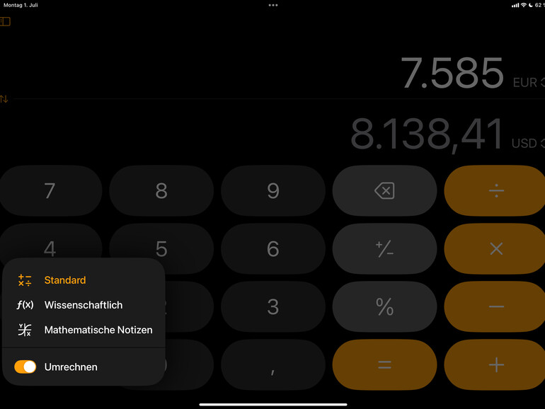 Die Taschenrechner-App bringt neben den mathematischen Notizen noch zwei weitere praktische Funktionen mit sich. Zum einen gibt es nun eine Rückschritttaste, mit der Tippfehler schnell gelöscht und korrigiert werden können, wo du im (vormals nur auf dem iPhone verfügbaren) Apple-Taschenrechner lediglich die gesamte Eingabe löschen konntest. Zum anderen kann die Taschenrechner-App diverse Umrechnungsoperationen vornehmen. Im Beispiel siehst du Währungen, möglich sind aber auch Winkel, Flächen, Energie, Kraft, Kraftstoffe und noch einige weitere.