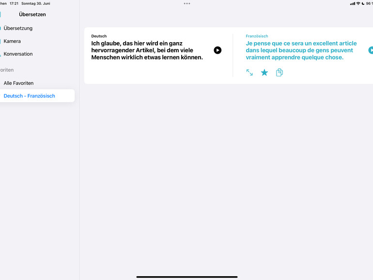 Auch für uns ist derzeit noch DeepL der unangefochtene Spitzenreiter, wenn es um das Übersetzen von Texten geht. Um mal eben schnell etwas in eine andere Sprache zu übertragen, ist Apples Übersetzer allerdings oft genauso gut. Schon länger kannst du Phrasen, die du häufiger benötigst, in Favoriten ablegen. Neu ist nun, dass diese via iCloud über all deine Geräte synchronisiert werden. Das ist natürlich ungemein praktisch, zum Beispiel, wenn du Sätze auf dem großen iPad-Bildschirm mit angeschlossener Tastatur vorbereiten, später dann aber auch auf dem iPhone parat haben möchtest.