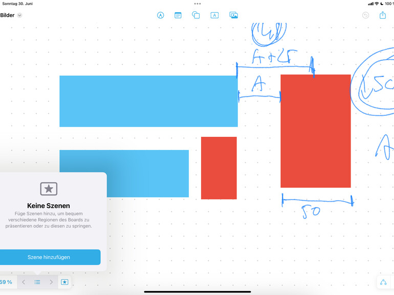 Freeform gehört zu den unterschätztesten Apple-Apps. Viele Menschen haben sie allerdings auch deshalb nicht auf dem Radar, weil sie eben nur auf Apple-Geräten funktioniert, eine Anwendung, die es mit Online-Whiteboard-Anwendungen wie Miro und Mural aufnehmen soll, oft aber auch in heterogenen Umgebungen funktionieren muss. Wie dem auch sei: Wenn du in Freeform ein komplexeres Board erstellt hast, wird es schnell schwieriger, die Übersicht zu behalten. Dafür gibt es nun Szenen, die eine Art von Lesezeichen für Freeform-Boards sind. Um sie zu nutzen, zoomst du in einen Bereich deines Boards und tippst dann unten links zunächst auf den Button mit dem Listen-Icon, dann auf „Szene hinzufügen“. Über das Listen-Icon kannst du danach zu den jeweiligen Szenen navigieren.