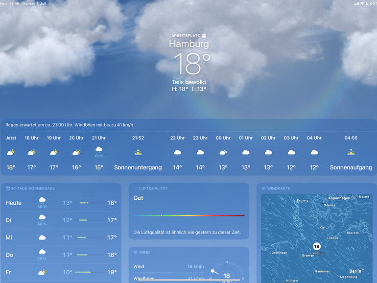 Die Wetter-App wird mit dem Update auf iPadOS 18 ein kleines bisschen hilfreicher. Wenn du auf deiner eigenen Kontaktkarte im Adressbuch deine Privat- und Arbeitsadresse hinterlegst und sie auch als solche gekennzeichnet hast, übernimmt die Wetter-App nun beide. So kannst du beim Wischen nach links und rechts immer auch sehen, wie das Wetter daheim oder am Arbeitsort ist, was ungemein praktisch ist, wenn beide Orte mehr als eine Fahrradtour voneinander entfernt liegen und sich die Wetterlagen tatsächlich stark unterscheiden können.