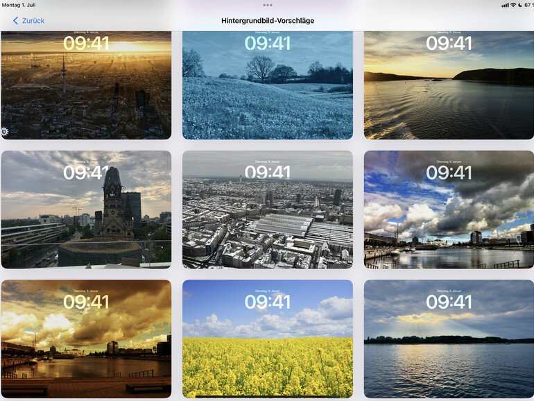 Wenn du in der neuen „Fotos“-App ganz nach unten scrollst (oder den entsprechenden Eintrag in der Seitenleiste suchst), findest du dort ein bislang nur wenig besprochenes Feature. Die App analysiert deine Bildersammlung im Hinblick auf Hintergrundbildtauglichkeit und präsentiert dir an dieser Stelle Fotos, die sie für besonders wertvoll hält. Das sind zumindest in unserem Test praktisch ausschließlich Landschafts- oder Architekturaufnahmen. „Fotos“ bemüht sich dabei, vermeintlich zu unruhige Bilder durch den Einsatz von Filtern gefälliger zu gestalten und, wo möglich, durch das teilweise Verstecken der Ziffern der Uhrzeit den schon länger bekannten 3D-Effekt herzustellen.