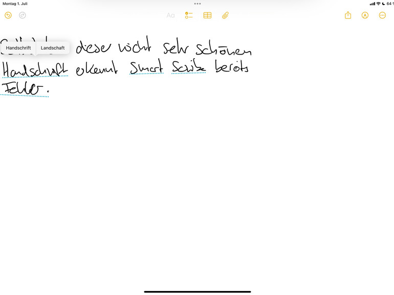 In den ersten Beta-Versionen ist „Smart Scribe“ noch reichlich fehlerhaft, aber schon jetzt ist zu erkennen, dass Apple hier Großes gelingen wird. Während die versprochene Glättung der Schrift zumindest in unseren Versuchen bislang nur sehr rudimentär funktioniert, werden Fehler oder nicht, beziehungsweise schlecht lesbare Worte angemerkt. Zu erkennen an der blaugepunkteten Unterstreichung. Ein Antippen des Wortes fördert ein Pop-Over mit Verbesserungsvorschlägen zutage. Die Umsetzung dieser Korrekturen lässt noch zu wünschen übrig.
