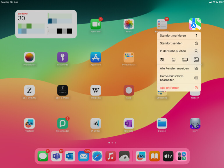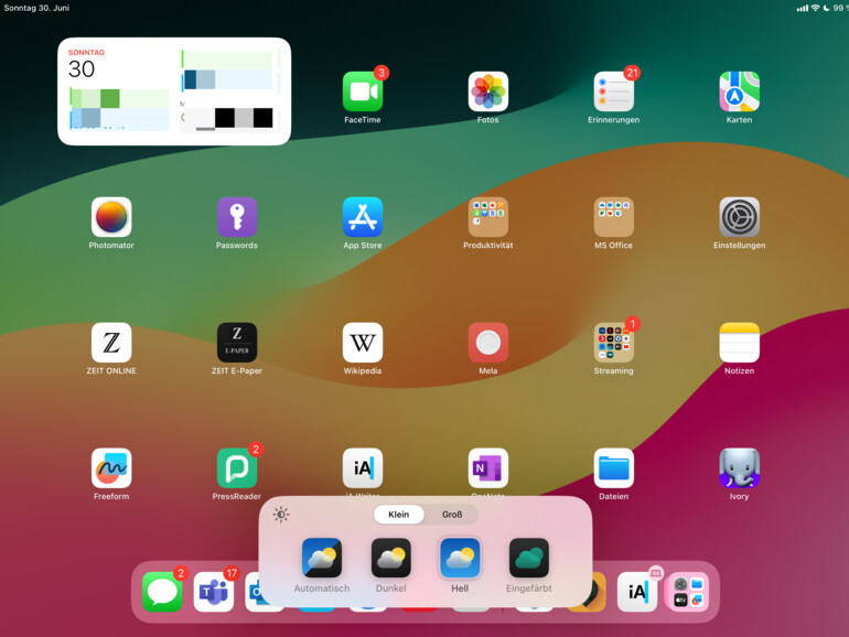 Du magst Widgets auf dem Home-Bildschirm? Wir auch! Und mit iPadOS 18 kannst du sie noch leichter erstellen. Dazu hältst du einfach das Icon der zugehörigen App gedrückt, bis das Kontextmenü aufspringt. Bei Apps, die diese Funktion unterstützen, findest du dort sodann eine Zeile, mit Icons für die unterschiedlichen Widget-Varianten. Hierüber kannst du dein neues Lieblings-Widget schneller als je zuvor erstellen. Aber Achtung: Das Widget ersetzt dann die App auf dem Home-Bildschirm, und das App-Icon wandert in die App-Mediathek. Über das Gedrückthalten des Widgets kannst du diesen Schritt jederzeit wieder rückgängig machen.